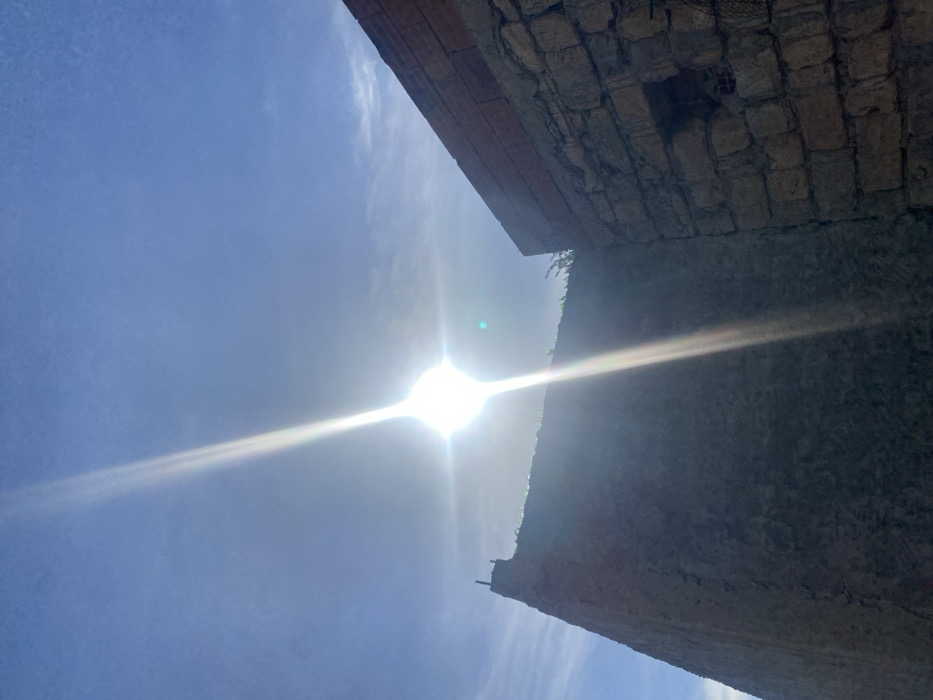 The image displays an outdoor scene in الغنادة, Tunisia, under a bright, sunny sky with sparse wispy clouds. The sun is prominently centered, emitting strong lens flare. Two building structures frame the lower portion of the sky. The structure on the left is a tall, dark, rough-textured wall, possibly concrete or earth, with sparse green vegetation growing along its top edge. Two small, dark vertical elements protrude from its upper left corner. The structure on the right consists of a wall constructed from light-colored stone blocks, topped with a course of reddish-brown bricks. This right-hand wall features a dark, rectangular recess or opening. No individuals or discernible actions are present.