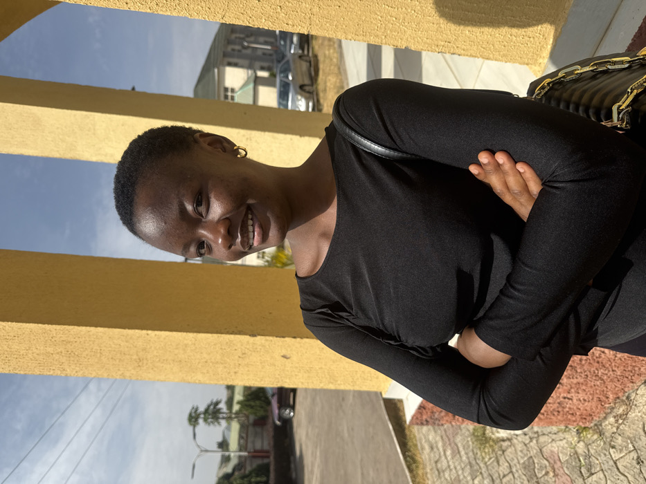 A young adult female, appearing to be of African descent, is depicted in a waist-up, outdoor portrait under bright sunlight. She has closely cropped dark hair, dark skin, and is smiling with her teeth visible, looking directly towards the viewer. She wears a black, long-sleeved top with subtle ruching on the left side of the chest, and gold-colored hoop earrings. Her arms are crossed over her midsection, and a black quilted shoulder bag with a prominent gold chain strap is visible on her left side. She is positioned between two tall, rectangular pillars painted a uniform bright yellow. The background, largely out of focus, reveals a clear blue sky with some faint cloud cover, a parking area with several light-colored cars (likely sedans), and a multi-story building featuring light-colored walls and a dark roof. Scattered green trees and a street light pole are also visible. The ground immediately to the left of the subject includes a textured reddish-brown surface and a lighter paved area. This scene is consistent with an urban or institutional outdoor setting within Jos, Nigeria.