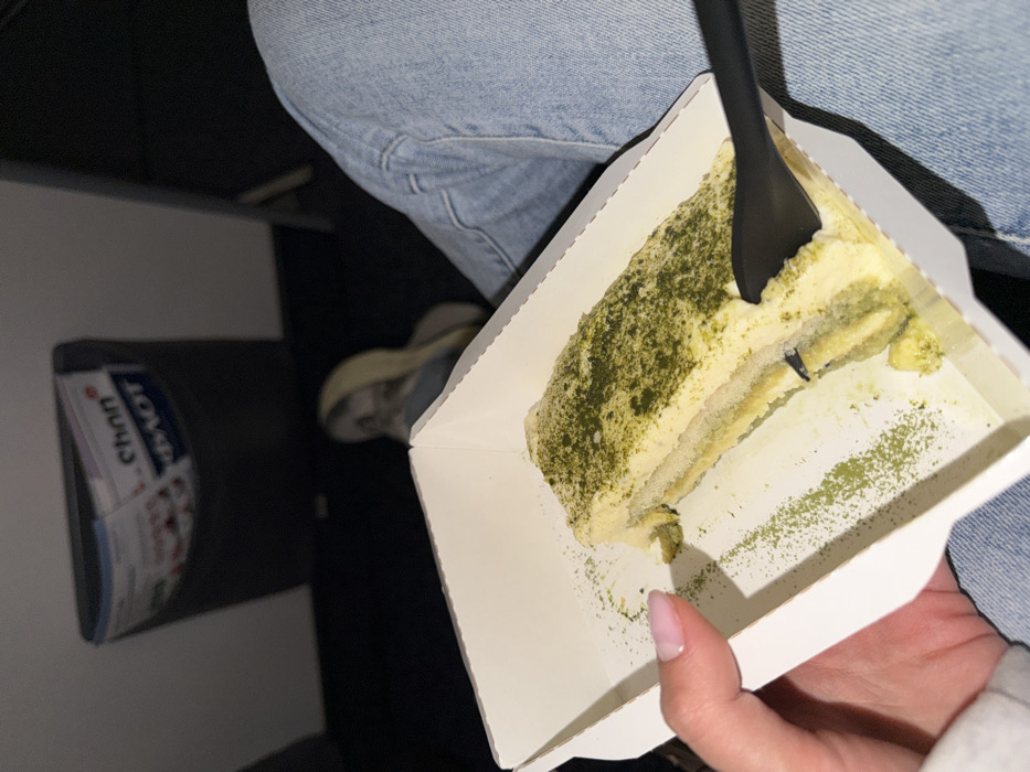 A dessert, dusted with green matcha powder, sits in a white container, partly eaten with a black utensil plunged into it. Light blue jeans surround the container. A hand with manicured nails holds the box. To the left, a table with a black surface holds a food packet with the brand name "Chkn" partially visible. A white and grey sneaker is subtly visible between the jeans and the table.