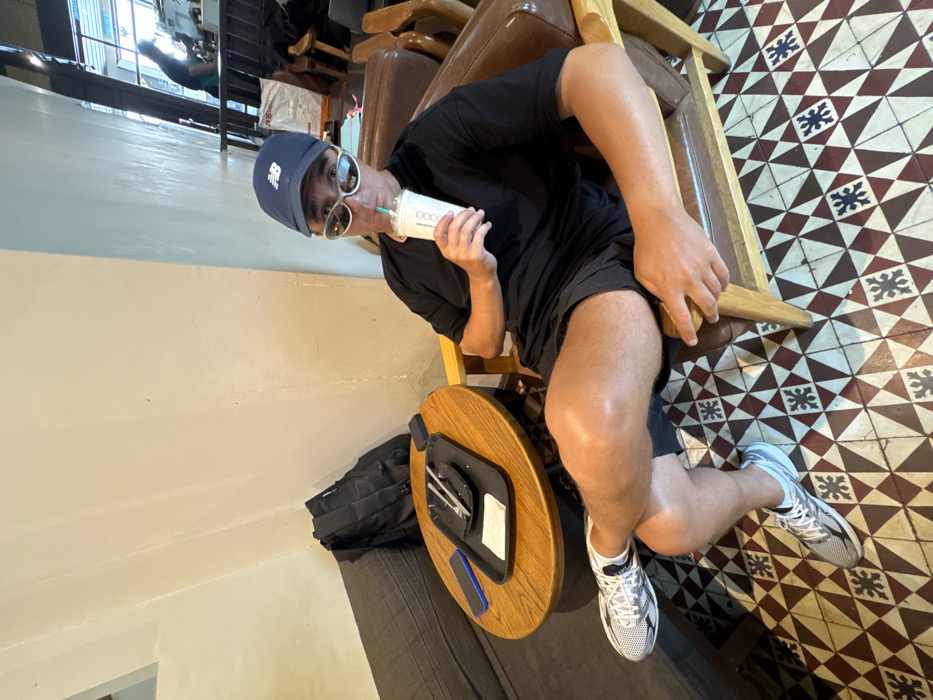 A person is sitting on a brown leather chair, wearing a dark blue baseball cap, sunglasses, a black t-shirt, and black shorts. They are drinking from a white cup with a straw. Beside the chair is a round, wooden table with a black tray and a blue phone on it. A black bag sits next to the table. The person is wearing white and grey sneakers. The floor has a tiled pattern of brown, white, and red.