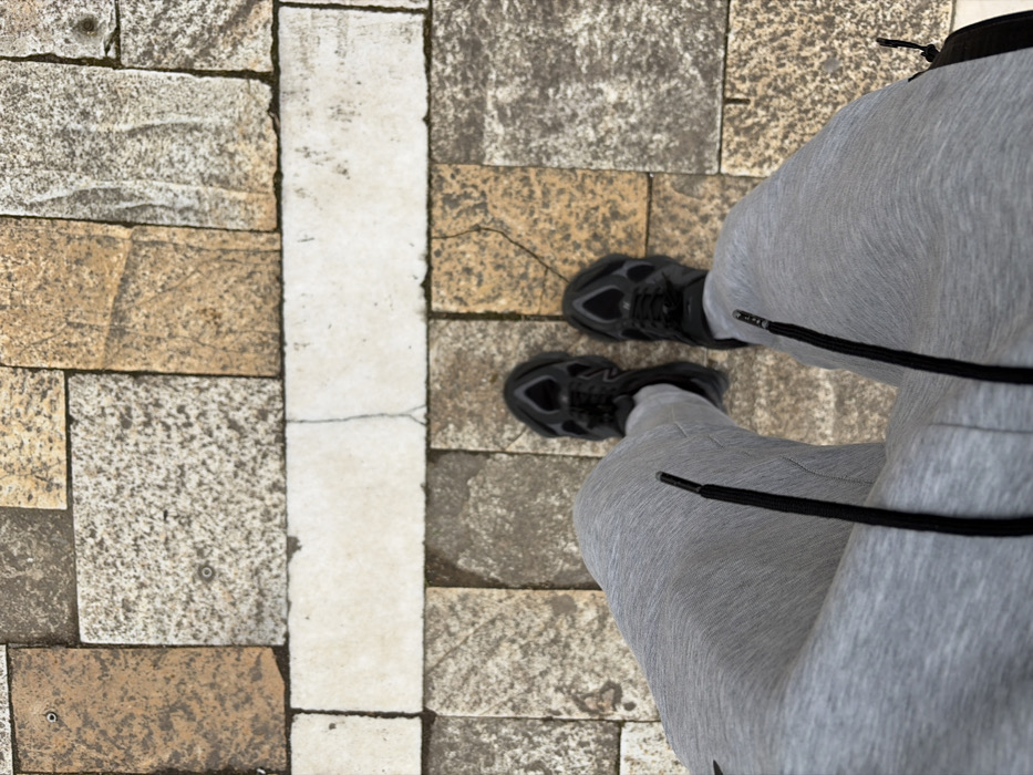 - "An overhead photograph captures the lower body of an individual, specifically their legs and feet, standing on a paved outdoor surface in Dimitrovgrad, Bulgaria" by FM-EEw2f2, licensed under CC BY 4.0