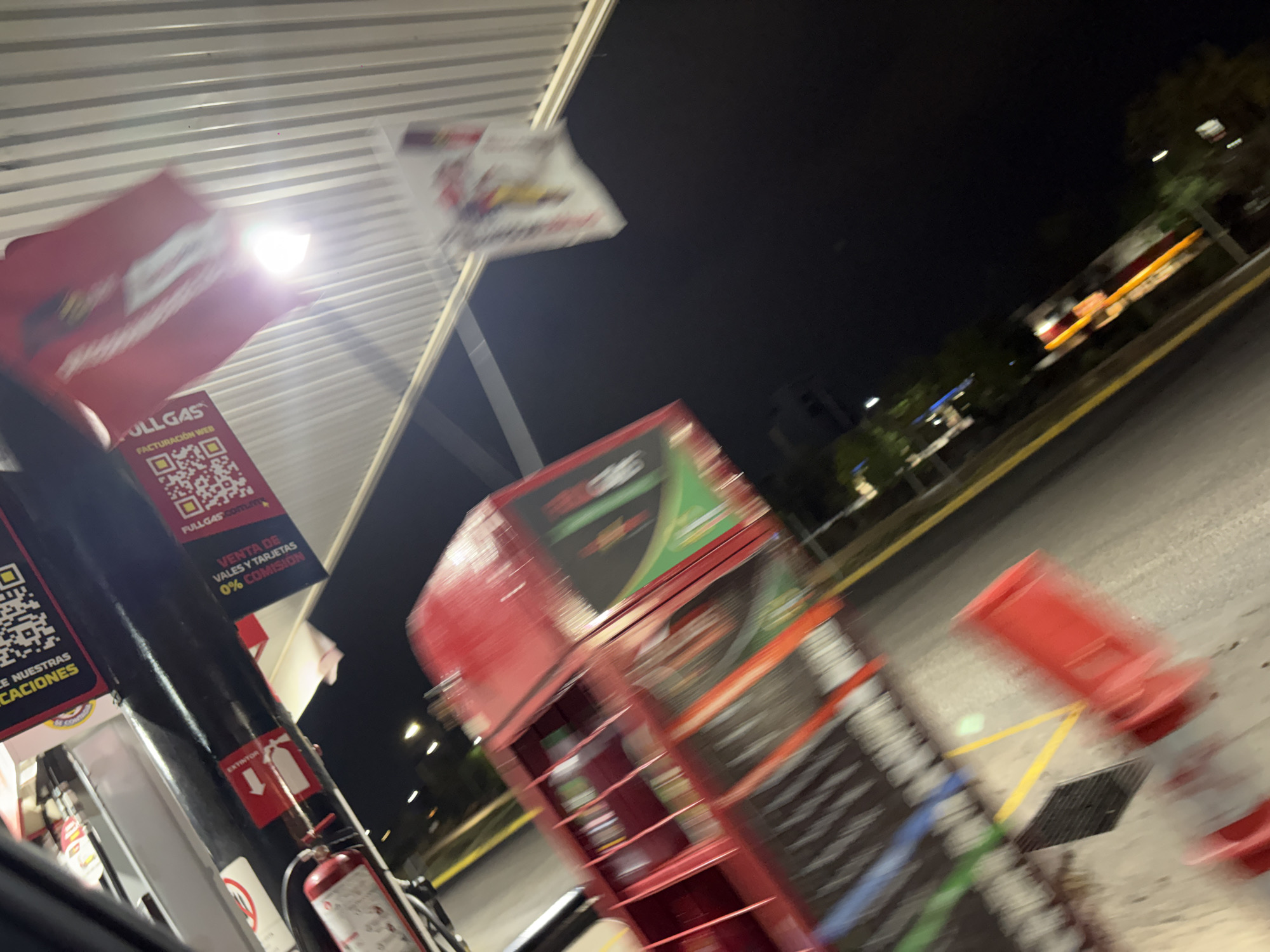 gas station in San Bernardino Tlaxcalancingo, Mexico, at night. The gas pump is equipped with a fire extinguisher and signage advertising "FULLGAS" and "FACTURACIÓN WEB". A sign also indicates the acceptance of vouchers and cards with a 0% commission. Other features are a display case and some traffic control devices nearby. The blurry nature of the image suggests movement, potentially from a handheld camera.