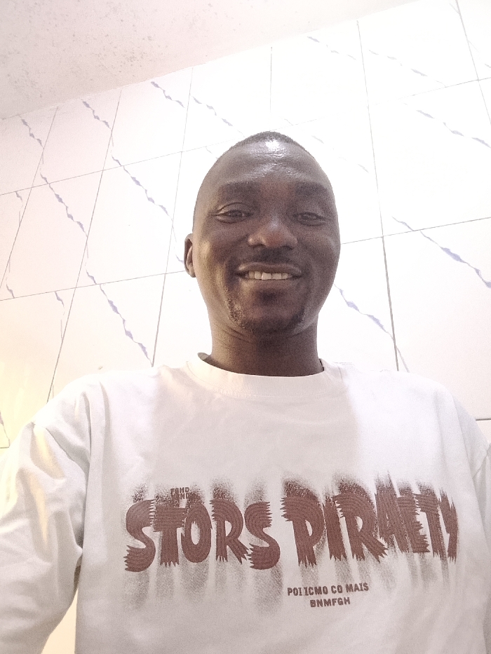 An adult male subject is depicted in a close-up, head-on shot in an indoor setting located in Akpajo, Nigeria. The subject is dark-skinned with a short, trimmed haircut, and a visible goatee or stubble on his chin. He is smiling directly at the camera, revealing his upper and lower teeth. He wears a white, short-sleeved t-shirt with distressed brown lettering on the front, which includes "STORS PIRATY" as a prominent element, and smaller, partially legible text above and below. The background consists of light-colored, possibly white, ceramic tiles arranged in a grid pattern on a wall. These tiles feature irregular, faint blue-grey vein-like patterns. A plain, light-colored ceiling is visible at the top of the frame. The lighting is bright and uniform.