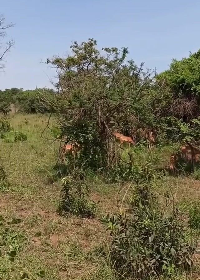 group of impalas grazing in a grassy, wooded area on a sunny day. The impalas are light brown in color and are partially obscured by trees and bushes. The vegetation consists of green grass, bushes, and trees. The sky is clear and blue. The video starts with a wider shot of the area and then zooms in on the impalas. The sound of a car starting can be heard briefly.