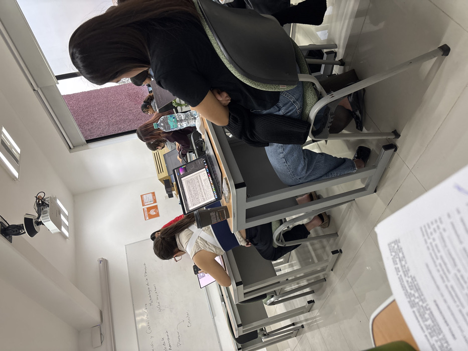 A classroom setting shows students working at computer stations. A whiteboard displays handwritten notes. One student wears a brace or support. Other students are seated, seemingly engaged in their work. A water bottle sits on a desk. A projector is mounted on the wall. The room is brightly lit, and papers are visible in the foreground.