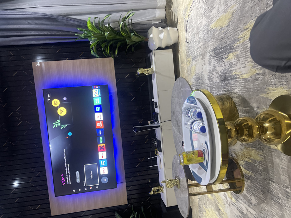 A modern living room features a flat-screen TV mounted on a wooden panel with blue LED backlighting. The TV displays a smart TV interface with apps like YouTube and Netflix. Below the TV is a white media console, adorned with small golden statues. A green, leafy plant sits atop the console. A multi-tiered coffee table with gold accents and grey marble-patterned tops holds bottled water and a jar. A patterned rug covers the floor.