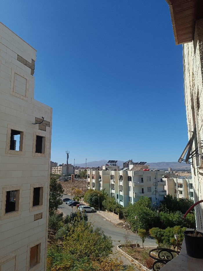 The image displays an urban landscape in Qudsaiya, Syria, under a clear, cloudless blue sky during daylight hours. In the left foreground, a multi-story building under construction or renovation presents an unfinished light-colored facade with several empty rectangular window openings. Exposed masonry blocks and what appear to be rebar elements protrude from its structure. On the far right, a section of an existing light-colored building with a textured facade is partially visible, featuring an extended window awning and a dark potted plant resting on a black metal railing. The mid-ground reveals a paved road, which curves through an area populated by green and autumnal trees and shrubs. Several vehicles, including at least five cars of various colors (white, black, dark blue, silver), are parked along this road. Beyond the road, multiple multi-story residential apartment buildings are visible, characterized by light-colored facades, balconies, and numerous rooftop solar panels. In the background, a communication tower stands prominently on an elevated position, with a range of hazy mountains extending across the horizon. No individuals are discernible within the scene.
