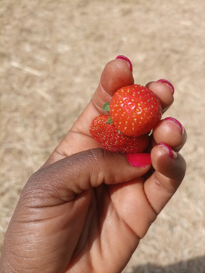 A close-up photograph depicts a human hand holding two ripe red strawberries against an out-of-focus background of dry, light brown vegetation. The specific city of Unknown, Unknown, is not discernible from the image; however, the scene appears to be an outdoor, natural environment, possibly a field or agricultural area, under natural light. The hand exhibits dark skin pigmentation. The fingernails are coated with a bright fuchsia-red nail polish. The upper strawberry is larger and rounder, positioned slightly above and behind the lower, smaller strawberry. Both strawberries display numerous yellow achenes (seeds) on their surfaces and retain small green calyxes at their stems. The hand is actively gripping the strawberries, with fingers partially curled around them.