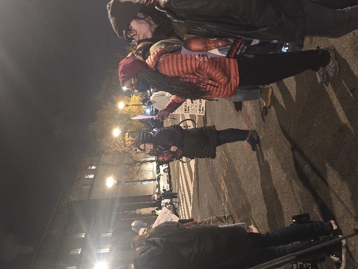 People stand on a street at night. Several hold signs and one holds a photo of a child. Streetlights illuminate the scene, casting shadows on the pavement. A building is partially visible in the background. The group appears to be protesting or demonstrating. There is a bicycle on the street.