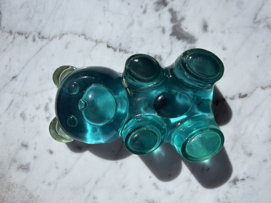 A transparent blue gummy bear shaped object rests on a white and grey marble surface