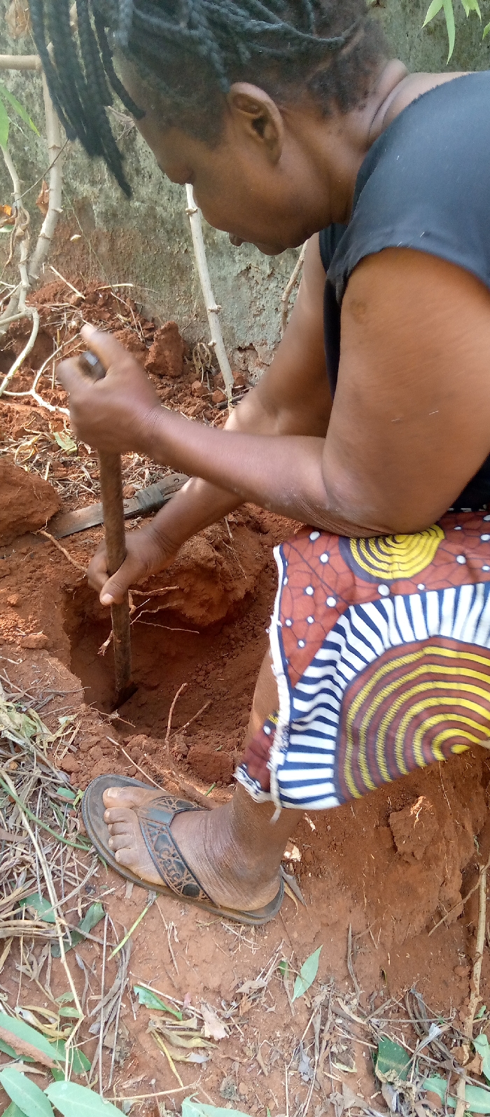 A woman digging in red soil with a metal bar is shown in a medium shot. She wears a dark top, colorful patterned fabric covering her lap, and a sandal. The soil has a few small roots and bits of dry grass. Part of a wall or large stone is visible in the background with sparse foliage. The woman's hair is braided. She is intently focused on the task at hand.