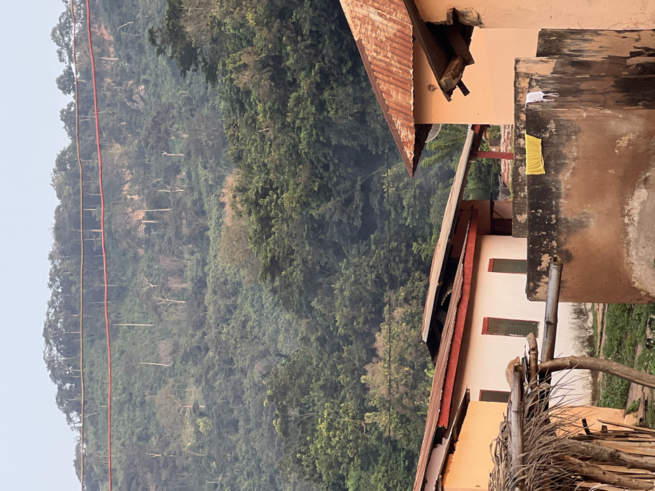 Lush, green forest climbs a hillside beside buildings with aged, rusty roofs. A red electrical line cuts through the hillside. One building features a faded pink exterior with simple, rectangular windows and a partial view of a clothesline with hanging items. The architecture appears old and worn, hinting at a rural or developing area. The scene captures a blend of nature and modest human settlement.