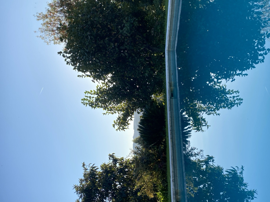 This image depicts an outdoor swimming pool area in Ponte de Lima, Portugal, under clear, sunny conditions. The lower half of the frame is occupied by a blue-tiled swimming pool filled with clear blue water. The pool's edge features a light-colored coping. Reflections of surrounding foliage and the sky are visible on the water's surface. Beyond the pool, a strip of green grass and dense vegetation rises, consisting of various trees and shrubs, including a prominent dark-green, palm-like plant. Some foliage, particularly on the right side, is brightly backlit by an unseen sun. In the distant background, light green hills or mountains are discernible beneath a bright, cloudless blue sky. A single, thin white contrail from an aircraft traverses the upper right quadrant of the sky. No individuals or specific actions are depicted.
