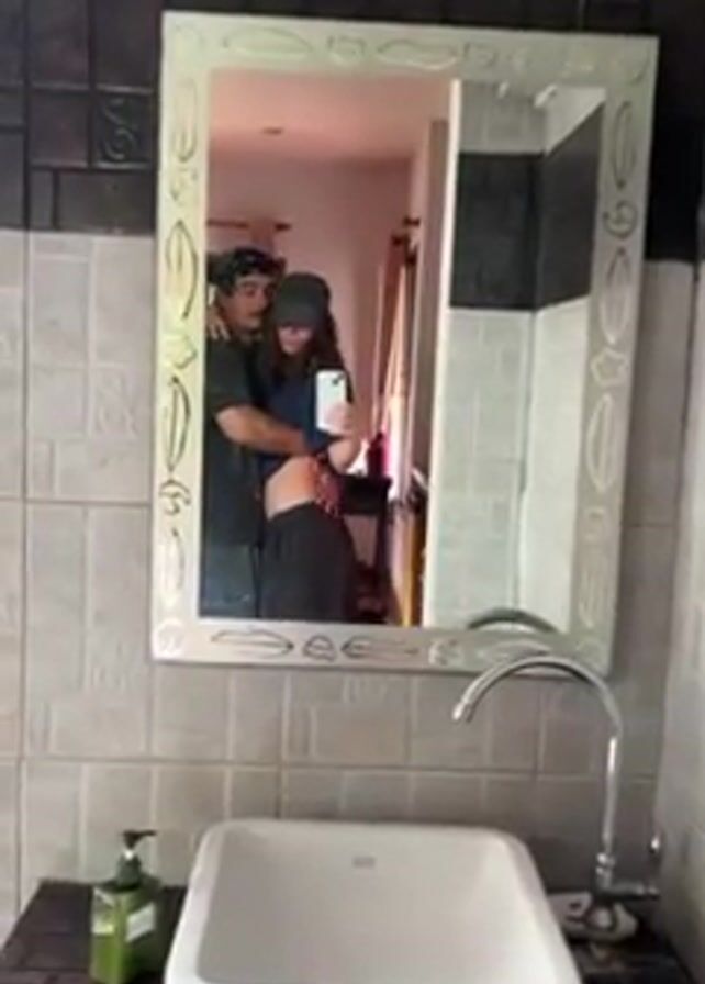 A couple poses in a bathroom mirror, taking a selfie with a smartphone