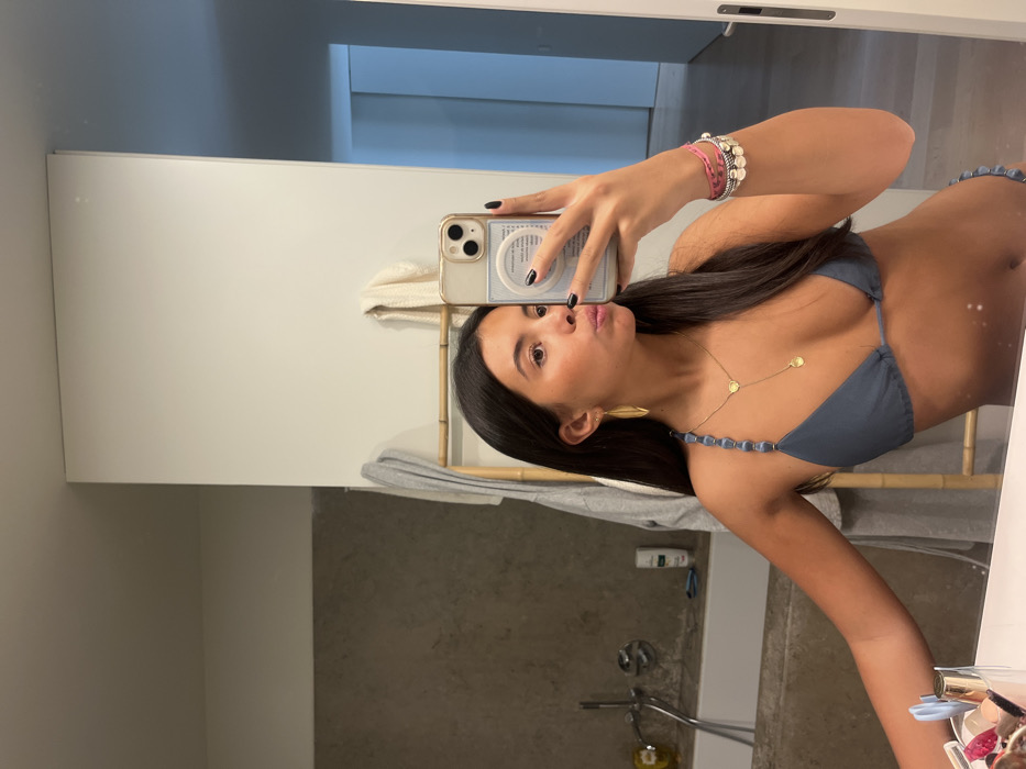 A young female is depicted performing a mirror selfie in a modern bathroom. She has long, dark hair, wears a grey-blue bikini top, and displays a pouting expression. Accessories include gold-colored leaf-shaped earrings, a gold-colored necklace with two circular pendants, and multiple bracelets on her left wrist, including a pink woven band and white beads. Her fingernails are painted dark. She holds a light-colored smartphone in her left hand, oriented for the selfie. The reflected background shows a bathroom with dark grey tiled walls, a silver-toned faucet, and bottles beside a bathtub or shower. A bamboo-style towel rack holds a grey and a cream-colored towel. White walls are visible, and a partially open white door leads to an interior space with a distinct blue illumination. A white vanity surface in the foreground holds a container of makeup brushes. The precise location within Lordelo do Ouro e Massarelos, Portugal, cannot be determined from the image.