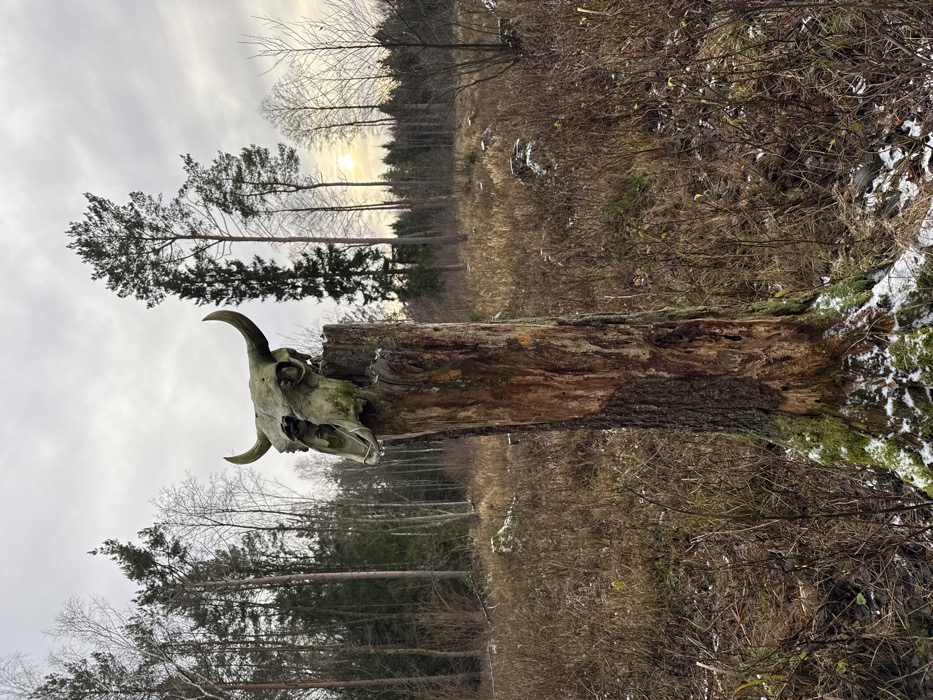 - "A weathered animal skull, identified as bovine or similar large mammal due to its prominent horns, is positioned atop a truncated tree trunk in a forested clearing" by FM-osXZC2, licensed under CC BY 4.0