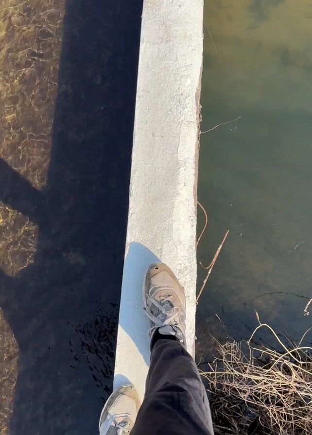 first-person perspective of someone walking along a narrow concrete beam. On either side of the beam is water, with visible shadows on the left side. The person is wearing sneakers and dark pants. There is some dry brush along the right side of the beam.