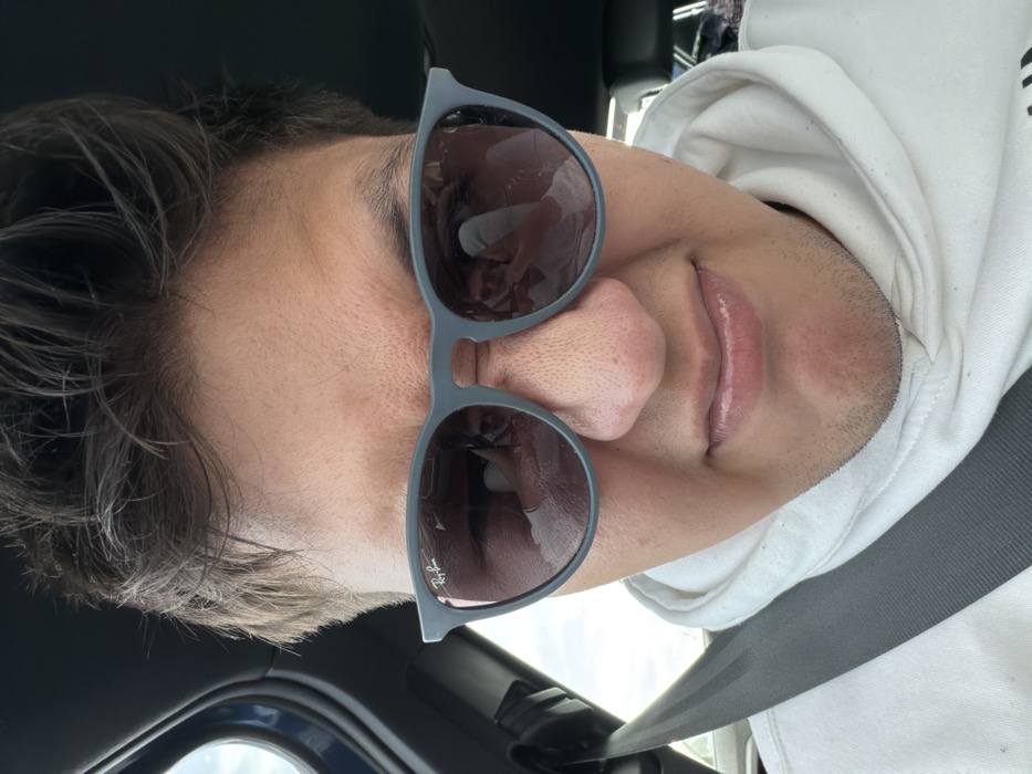 A man wearing sunglasses is seated, likely in a car, as evidenced by the seatbelt. He has dark hair and is wearing a white hoodie. The sunglasses obscure his eyes but reflect the interior of the car and what seems to be a white object. The angle is slightly tilted, focusing primarily on his face and the sunglasses.