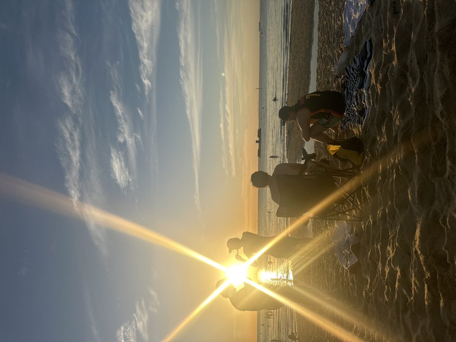 The image depicts a coastal beach scene at sunset in Black Rock, Australia. The sun, low on the horizon to the left-center, generates significant lens flare across the frame, silhouetting figures and casting a golden hue over the environment. The sky is a gradient from golden-orange at the horizon to light blue overhead, with scattered wispy white clouds. The calm ocean surface reflects the sunlight, and multiple dark figures are visible wading or swimming in the water. In the distance on the right, block-like structures, likely coastal defense or pier remnants, are visible, along with a vertical marker pole and faint silhouettes of distant vessels. On the sandy beach in the mid-ground, five individuals are present. Three figures are standing near the water's edge on the left, largely silhouetted by the sun. One appears to be raising an object to their mouth. To the right, two individuals are seated facing the ocean, with their backs to the camera. One is seated in a dark, foldable beach chair. The other is seated directly on the sand to their right, wearing a dark sleeveless top with a white number "7" on the back and a dark baseball cap. A yellow and black bag, a striped towel, and a white towel are positioned on the sand near the seated figures. The foreground features textured sand with visible footprints.