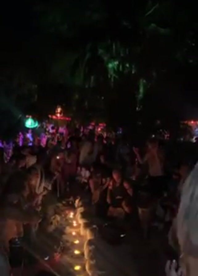 The video depicts a nighttime gathering of people at what appears to be a beach party. A row of lit candles lines a sandy path in the foreground, leading towards a large group of people illuminated by colorful lights. The crowd seems to be dancing, socializing, and holding objects, possibly instruments. Palm trees and other foliage surround the area, contributing to a tropical ambiance. Overall, the video captures a lively and festive atmosphere at a beachside celebration.