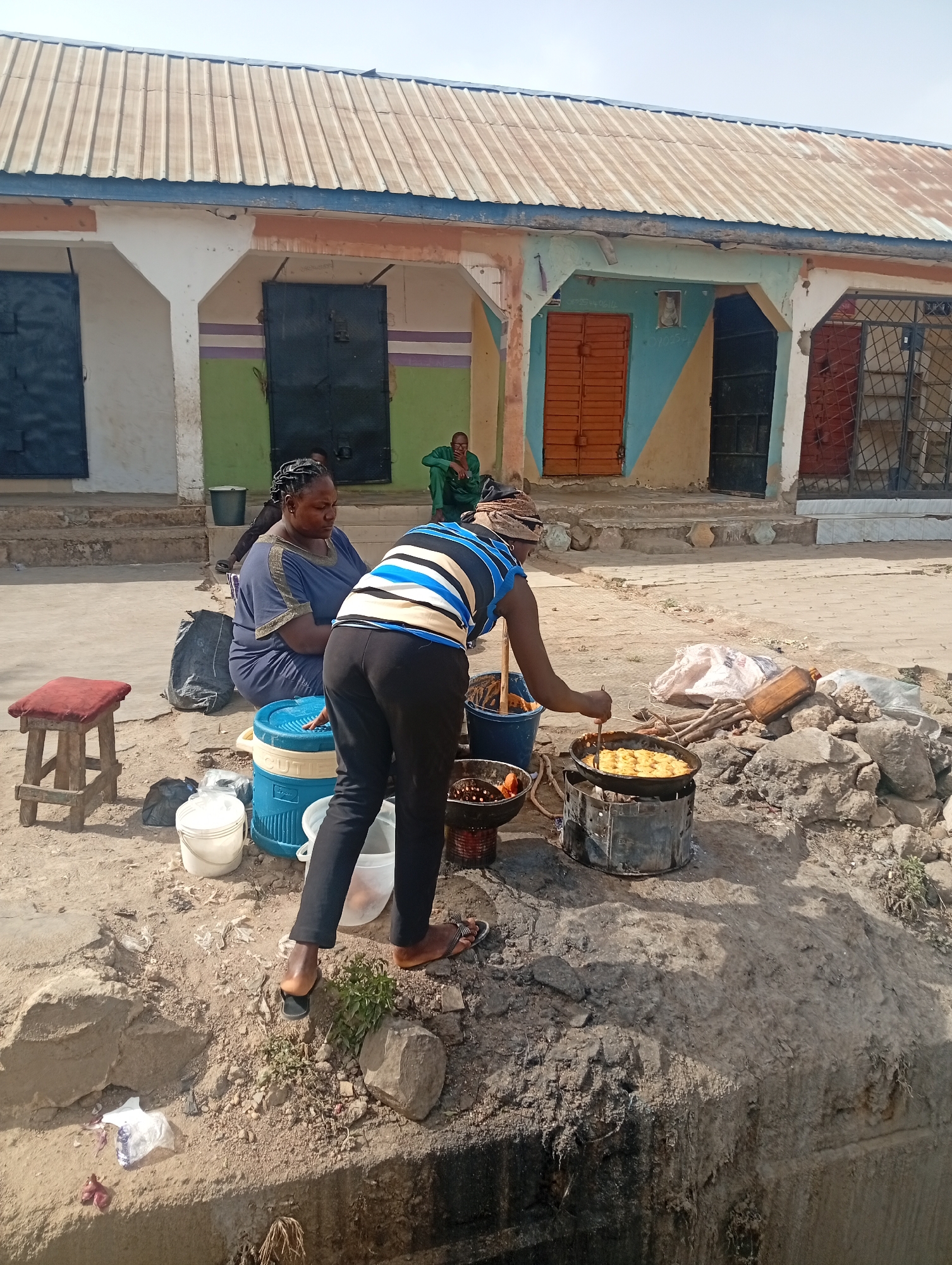 This image depicts an outdoor food preparation and vending scene in Jos, Nigeria, under clear daylight conditions