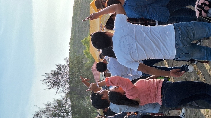 group of people gathered in an outdoor setting, likely a festival or celebration, based on the festive atmosphere and presence of tents