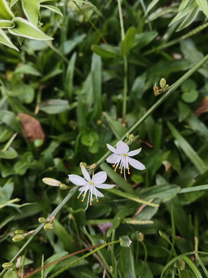 - "A close-up shot captures two small, six-petaled white flowers with prominent yellow anthers/stamens, situated on a slender green stem" by FM-dMT6c2, licensed under CC BY 4.0