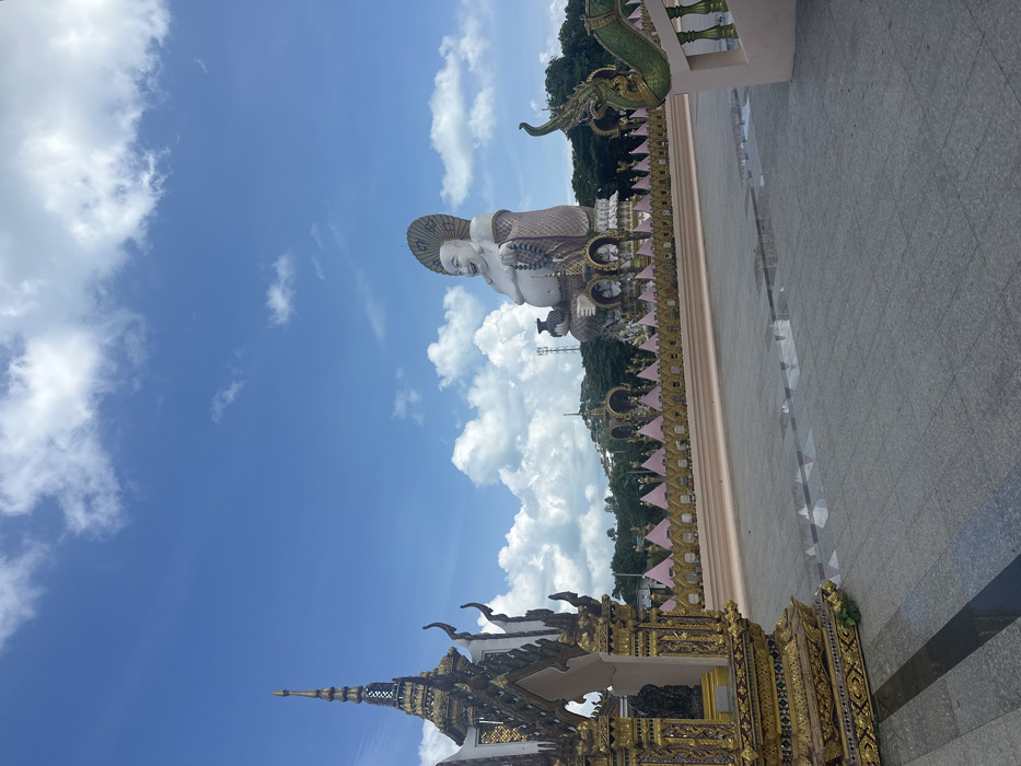 A large, light-skinned statue of a smiling man with a hat sits atop a decorative gold railing. The statue is surrounded by a bright blue sky with puffy white clouds. Below the statue is a golden structure with intricate carvings, and a gray tiled walkway stretches to the right. Green trees are visible in the background.