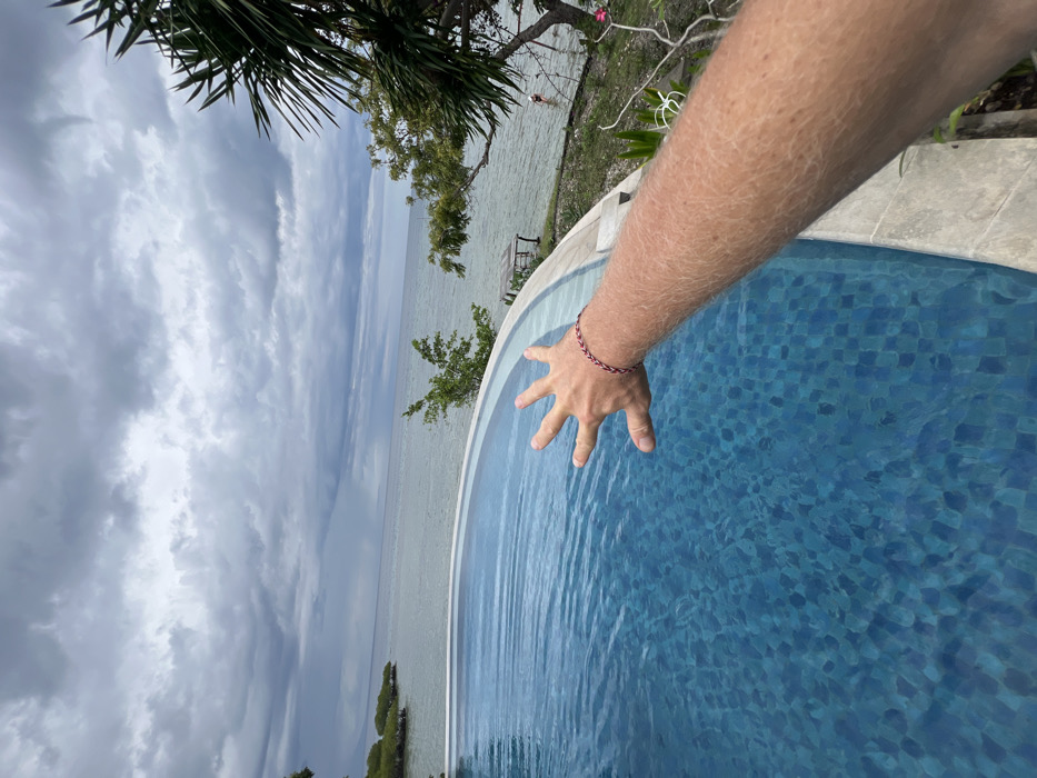 A hand reaches toward the edge of an infinity pool. The pool's blue water blends seamlessly with the ocean beyond, under a cloudy sky. Palm trees and other greenery surround the pool area. A person stands in the ocean in the distance. A bracelet adorns the wrist above the hand.