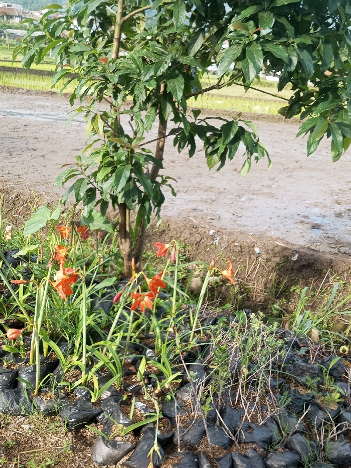 - "A small tree stands amidst a field of vibrant orange amaryllis flowers planted in black plastic bags" by FM-akBCv1, licensed under CC BY 4.0