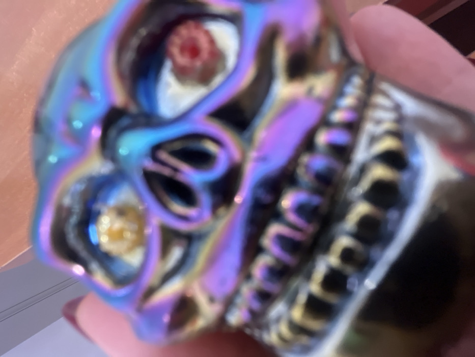 A blurry, close-up of a metallic, iridescent skull object held in someone's hand
