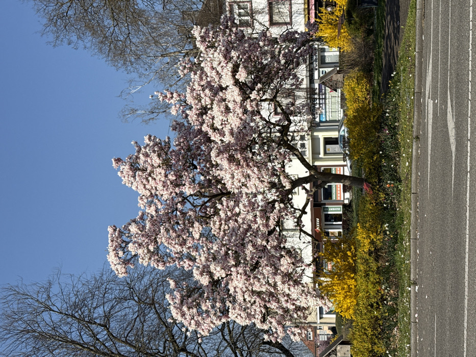 The image depicts a vibrant spring urban landscape in Haguenau, France. A large, mature magnolia tree, covered in abundant light pink to white blossoms, dominates the central midground. Its dark brown trunk and branches are visible beneath the dense canopy of flowers. In the immediate foreground, a grey asphalt road with faint white directional arrows and a solid white line occupies the bottom portion of the frame. This road is bordered by a concrete curb, beyond which lies a landscaped median. This median features dense clusters of bright yellow flowering shrubs, likely Forsythia, flanking the magnolia tree. Green grass with scattered small white and orange-tipped flowers (consistent with early spring bulbs) grows among the shrubs. A small, dark brown, multi-level structure resembling a birdhouse is situated within the yellow shrubs on the right side of the median. In the background, behind the magnolia and shrubs, a row of multi-story buildings with light-colored facades is visible under a clear, intense blue sky. Ground-floor businesses with visible signage, including "Pizzas" and "Cabinet d'Optique," line the street. A dark-colored sedan is partially visible parked near the buildings on the right side. Bare deciduous trees with dark, intricate branches frame the scene on the far left and right against the sky, indicating an early spring season. The scene is brightly illuminated by direct sunlight, casting minimal shadows. No individuals or discernable actions are present in the frame.