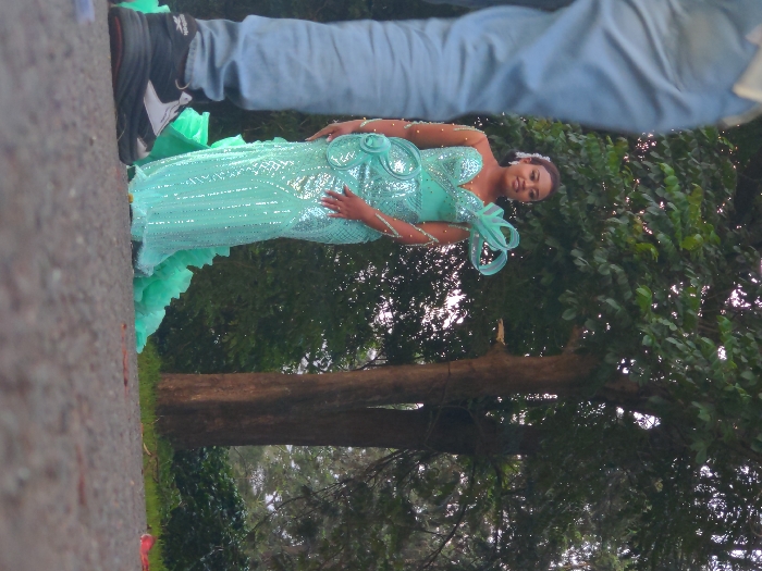 woman wearing a teal sequined gown standing on a paved road. The woman is facing the camera, with her left hand on her hip and her right hand holding the skirt of her dress. The woman is wearing a teal, sparkly gown with a ruffled skirt. The dress has a low, sweetheart neckline and a beaded bodice. The woman has dark hair and dark skin and is wearing a small amount of makeup. The background of the image shows a tall tree with a thick trunk and a lush green canopy. The trees are located in New Hope, Tanzania. The coordinates (latitude: -3.275, longitude: 37.317) indicate that the trees are located in a rural area of New Hope. The person taking the picture is standing behind the woman and only the bottom half of their body, including one leg and a black shoe, are visible in the foreground of the image. The road appears to be unpaved and there are small pebbles scattered throughout the ground. There are leaves on the ground, a few of them are red. The image was likely taken at a park or a nature preserve in New Hope.