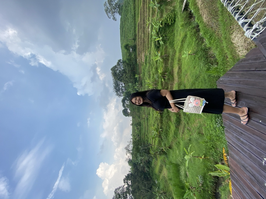 An outdoor scene in Tamiajeng, Indonesia, features a single adult female standing on a dark wooden plank platform. The woman has long dark hair, wears glasses, a black short-sleeved knee-length dress, and dark flat sandals. She holds a light-colored woven tote bag with a pink cartoon charm in her left hand and smiles toward the viewer. The background consists of extensive green terraced agricultural fields, densely planted with banana trees and other vegetation across rolling hills. A blue sky with scattered white clouds is visible overhead. A white rope netting is partially visible to the right of the platform.