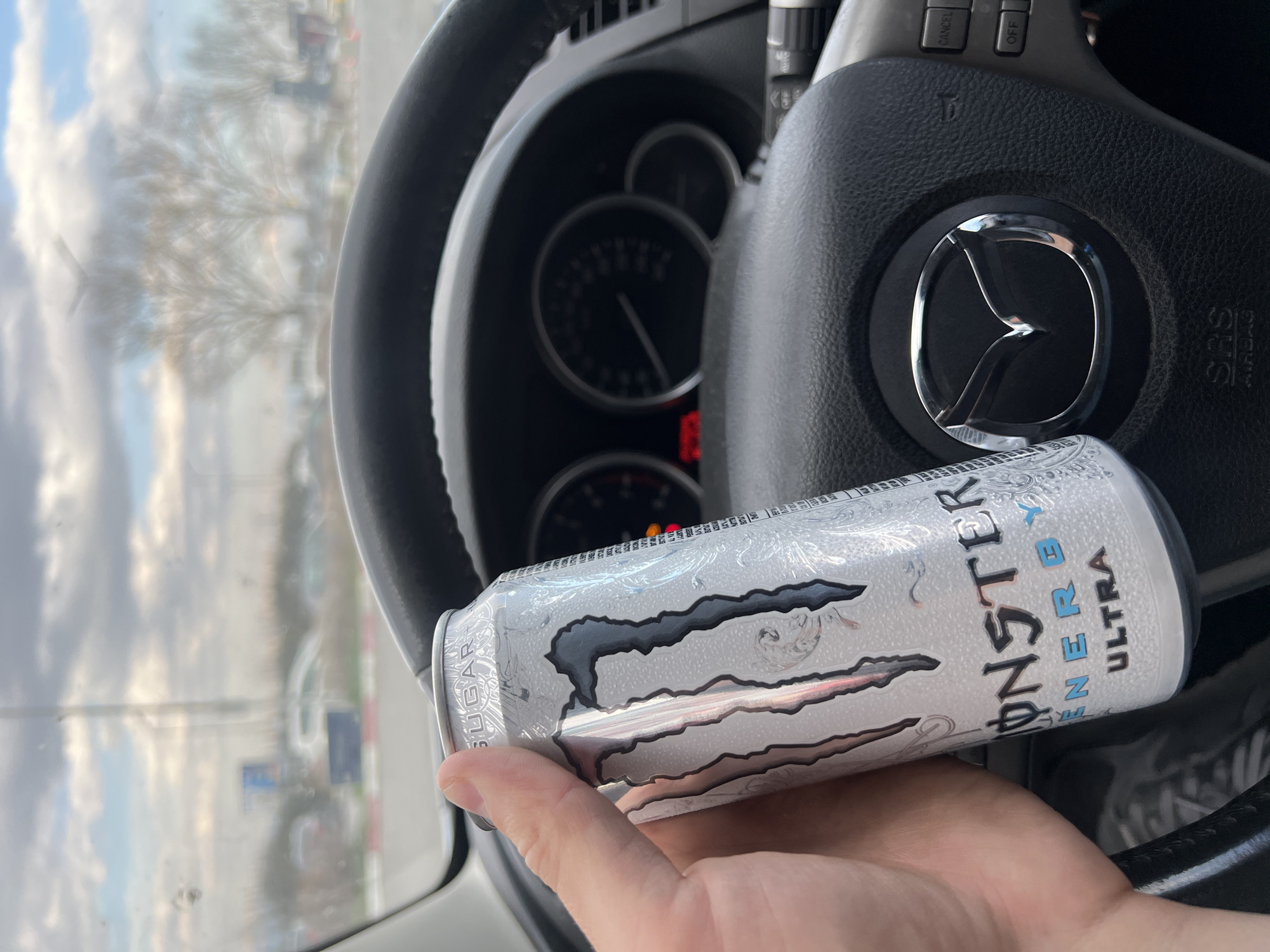 A human left hand holds a silver Monster Energy Ultra can, visible with condensation droplets, in the foreground of a car's interior