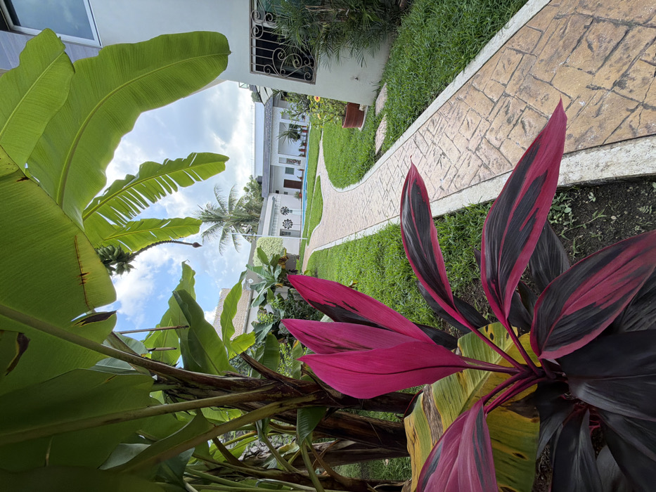 A vibrant garden scene unfolds. Lush green banana leaves dominate the left, reaching towards a sky filled with clouds. A walkway of patterned stones curves through verdant grass leading to a white building. To the right, a plant with striking red and black striped leaves adds a pop of color. The perspective is slightly tilted, giving a unique view of the tropical foliage.