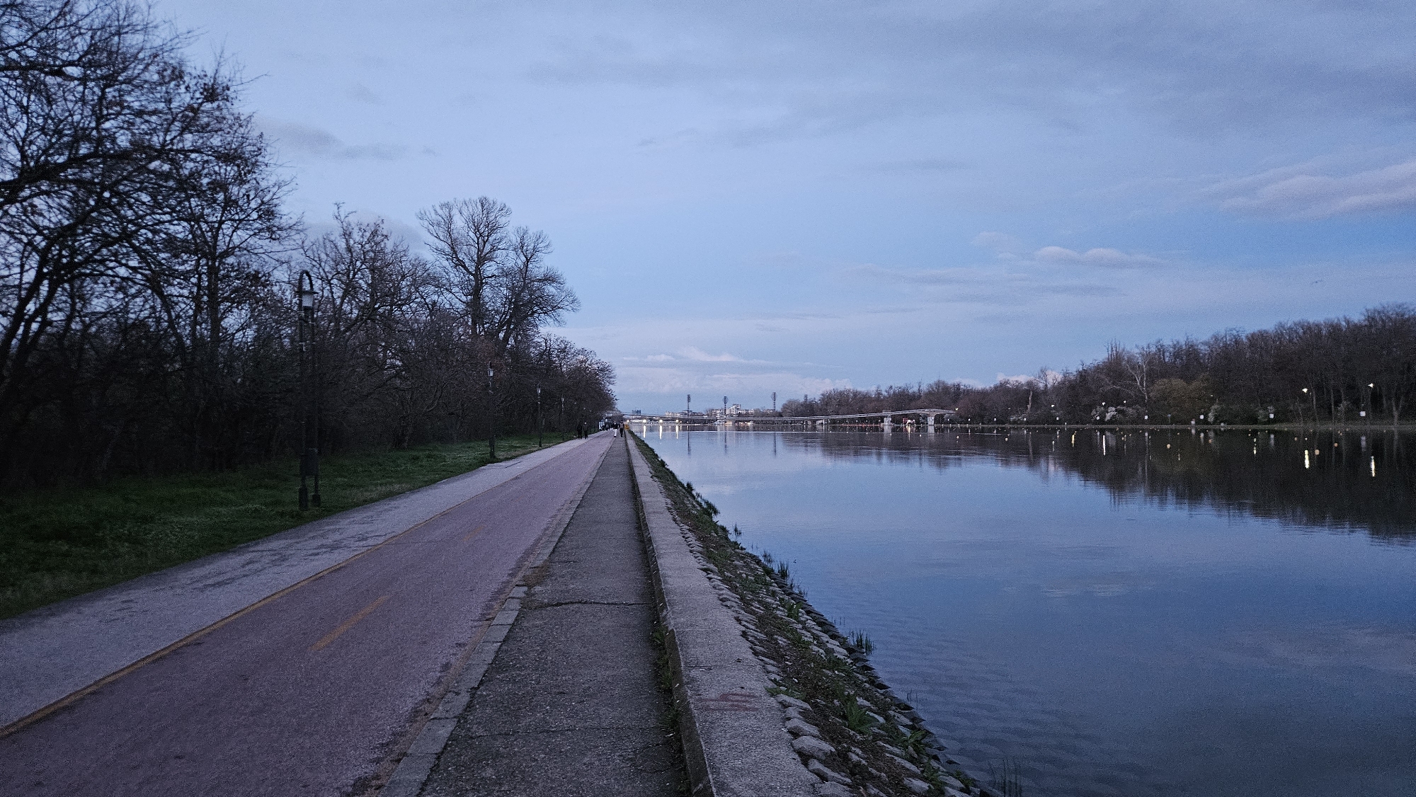 This image depicts a long, straight paved path alongside a body of water, likely a river or lake. The path has a yellow line indicating a bicycle lane. A low concrete wall separates the path from the water's edge, which is reinforced with stones. On the opposite side of the path, there are trees and grass. The trees appear bare, suggesting it is late fall or winter. Across the water, there is a wooded area and, in the distance, a bridge or structure with multiple supports. The sky is overcast with a blue tint. People can be seen walking on the path in the distance. There is likely a lake, as there are white lights reflecting on the water. This is a scene along the Maritza River in Plovdiv, Bulgaria.