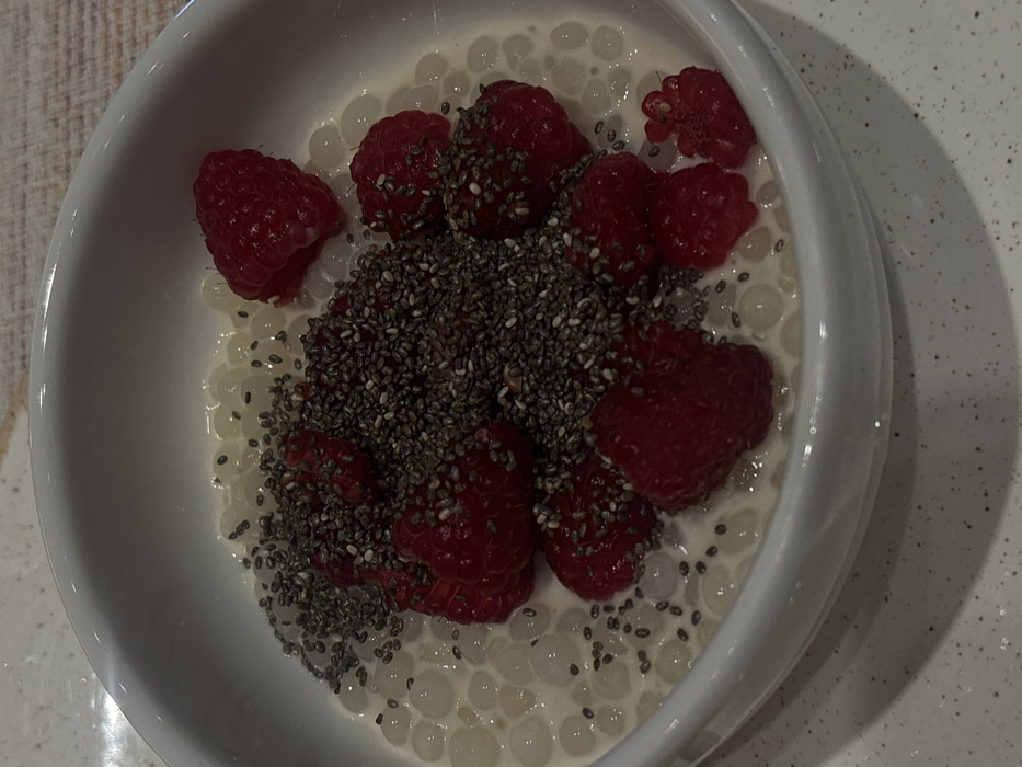 A white ceramic bowl containing a dessert or breakfast item is positioned on a light-colored, speckled surface. The bowl holds a creamy, white liquid base with numerous translucent, white spherical pearls. Scattered throughout the bowl are approximately twelve to fifteen whole red raspberries and a substantial quantity of dark gray/black chia seeds, heavily concentrated towards the center and distributed over the other ingredients. The scene is located in Playa del Carmen, Mexico.