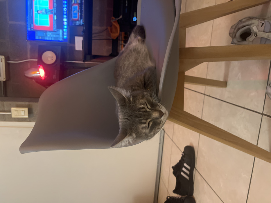 - "An indoor scene in the city of Buenos Aires, Argentina, depicts a grey tabby cat resting horizontally on a grey plastic chair" by FM-qsFQD2, licensed under CC BY 4.0
