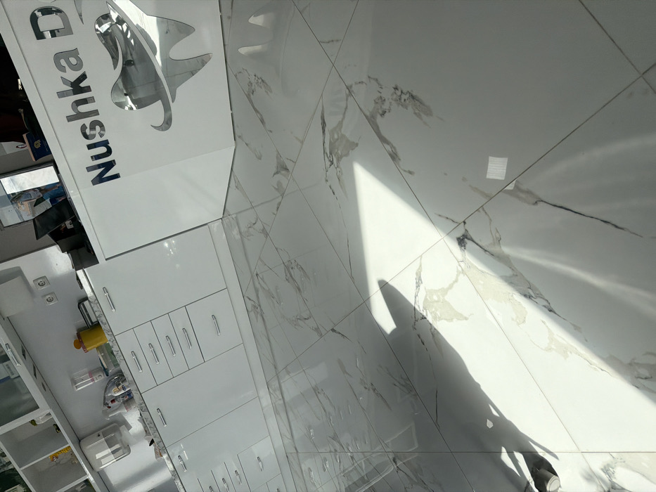 This image depicts the interior of a modern dental clinic, identified by signage as "Nushka D," located in the city of Hvostiane, Bulgaria. On the left, a long, white, high-gloss cabinetry system with multiple drawers featuring chrome pull handles extends along a wall. A white countertop above the drawers holds a clear plastic water dispenser, a yellow lidded biohazard waste bin, and various smaller containers. Open shelving is visible above the countertop. To the right, a white reception desk displays the name "Nushka D" in reflective metallic lettering, accompanied by a reflective metallic tooth-shaped logo. A laptop and a computer monitor are positioned on the desk. The floor is covered with large, polished white ceramic tiles featuring distinct gray and black marble-like veining. Direct sunlight streams into the space, casting sharp, angular shadows across the reflective floor. No individuals are visible in the scene.