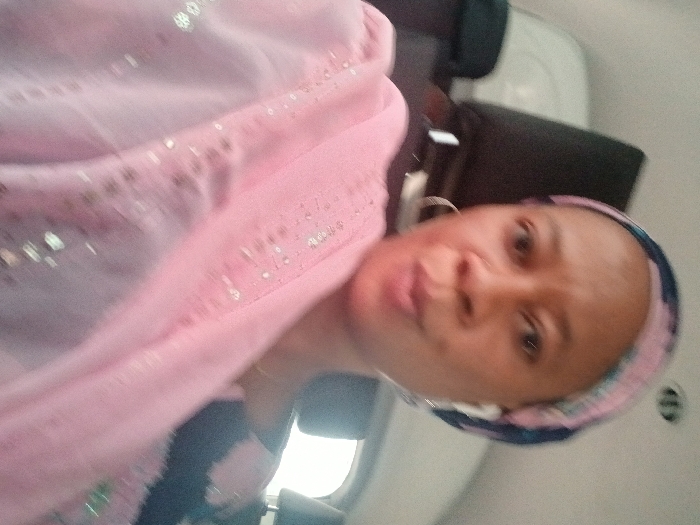 The image presents a close-up, eye-level view of an adult female, appearing to be a selfie taken from inside a vehicle. The subject is looking directly at the camera with a neutral expression and slightly pursed lips. She wears a patterned head covering, predominantly pink and blue. A large pink shawl, adorned with reflective embellishments (sequins or beads), is draped over her left shoulder and upper torso. A dark garment with lighter, possibly floral, patterns is visible beneath the shawl. The subject wears a silver-colored hoop earring in her left ear, a thin gold-colored necklace, and a white earbud in her right ear. The background consists of blurred vehicle interior elements, specifically dark headrests behind her and a window to the right showing diffuse outdoor light. The image provides no specific visual cues to confirm the location as Unguwar Shanu, Nigeria.