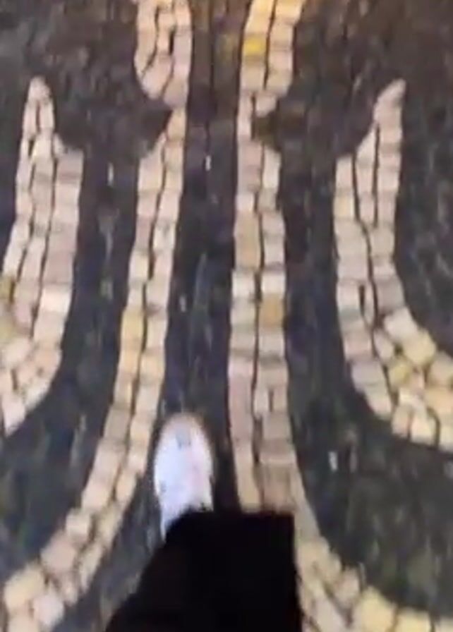 street in Lisbon decorated for Christmas. The street is paved with a mosaic pattern, and there are Christmas lights strung across the street. The lights are in the shape of clouds and raindrops, and the buildings on either side of the street are decorated with lights as well. People are walking along the street. The video starts with a close-up of the mosaic pavement before panning up to show the street.