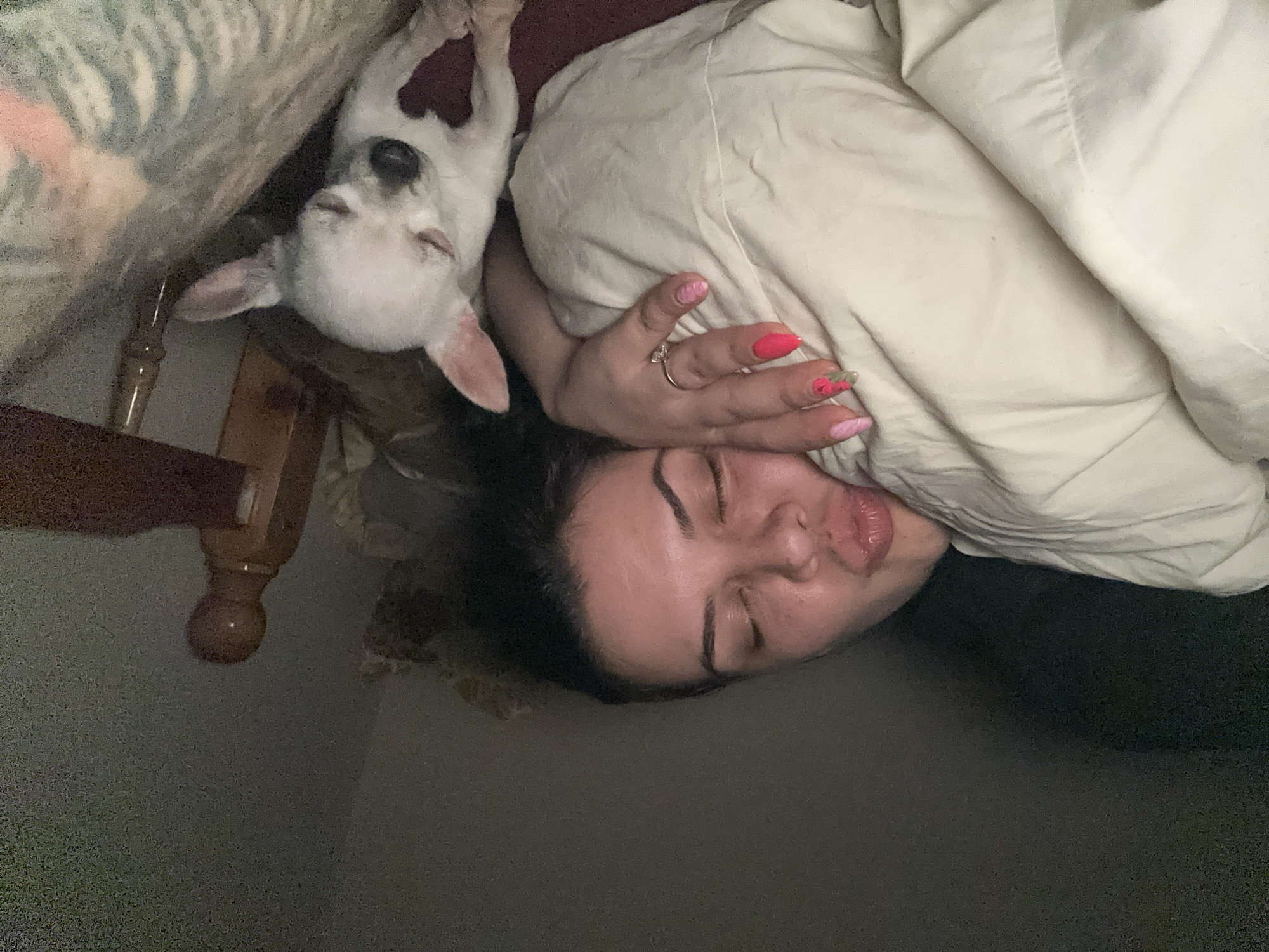 The scene depicts an indoor environment, likely a bedroom, with two sleeping subjects. No specific visual identifiers within the image corroborate a location in Skala, Bulgaria. An adult human individual, appearing to be female with dark hair, is shown sleeping on her left side, oriented towards the left of the frame. Her eyes are closed, and her lips are slightly parted. Her right hand rests near her head, displaying an ornate ring on the ring finger and fingernails painted with varying shades of pink, some featuring glitter or patterns. She is partially covered by a light-colored, possibly off-white, duvet or comforter. Adjacent to the human, a small, white dog, consistent with a Chihuahua breed, is also sleeping, with its eyes closed. A dark, maroon-colored heart-shaped object or cutout is visible on its chest area. The dog is positioned on a patterned surface, possibly a pillow or blanket, featuring grey and white patterns with subtle hints of pink or red. In the upper right portion of the frame, a wooden bed frame component, possibly a headboard post with a turned finial, is partially visible. The lighting is dim, contributing to a low-light, nighttime ambiance. The background is largely indistinct due to the low light.
