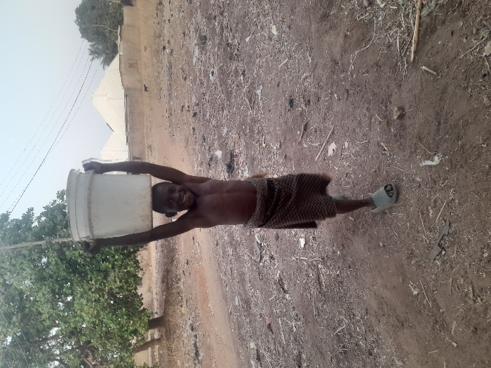 A young male individual is depicted outdoors in Akwanga, Nigeria. He stands centrally, bare-chested, wearing a dark patterned waist wrap and light-colored open-toed sandals. He smiles directly at the viewer while balancing a large, white plastic bucket on his head, held aloft with both arms raised. The bucket appears empty. The scene features an unpaved, reddish-brown dirt ground covered with sparse debris. A large green-leafed tree is visible on the left. In the mid-ground, multiple buildings with light-colored, sloped roofs are present, along with overhead power lines. A dark, quadruped animal is discernible near the buildings. The sky is bright.
