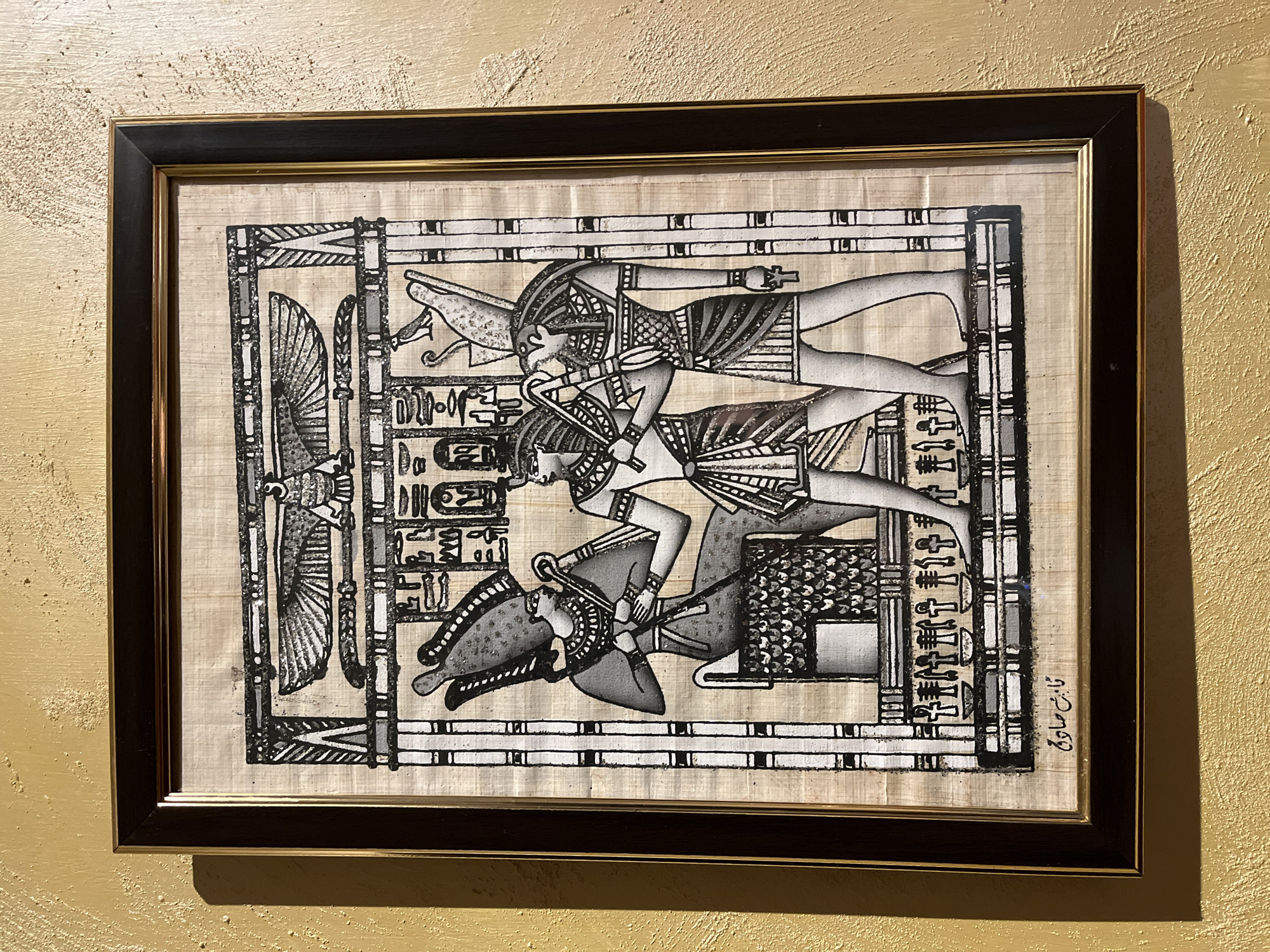 A framed papyrus painting, depicting an Ancient Egyptian scene in black, white, and grey tones, is displayed on a textured, mustard yellow wall in General Toshevo, Bulgaria
