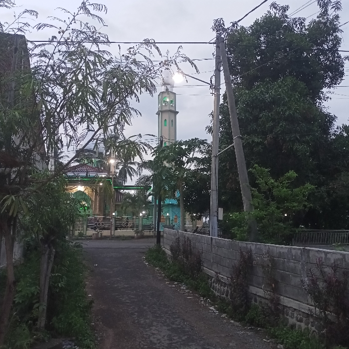 The image depicts a static exterior scene in Ketowan, Indonesia, at what appears to be either dusk or dawn under an overcast sky. A narrow, dark, unpaved path, approximately 2.5 meters wide, extends into the midground, leading towards a mosque complex. On the left side of the path, in the foreground, dense green foliage and tree branches with compound leaves partially obscure the view. Further along the left, in the midground, a mosque building is visible, illuminated by bright green LED strip lighting outlining its arched entrance and architectural features. A dome structure and a white, possibly metal, fence or gate are also discernible at the mosque's perimeter. On the right side of the path, a low, approximately 1.5-meter-high, grey concrete block wall with a rough stone foundation runs parallel to the path. Small, dark-leafed shrubs are planted at the base of this wall. Further right, in the midground, two dark utility poles stand vertically, supporting multiple overhead electrical wires that traverse the upper portion of the frame. Large, mature green trees are situated behind and to the right of these poles. Dominating the central midground is a tall, slender mosque minaret, light-colored (possibly off-white or light beige) with pale green trim around its windows and a balcony-like structure near its apex. A bright, white omnidirectional light fixture is visible near the top of the minaret, illuminating the immediate area. No individuals, animals, or active movements are present within the frame. The scene conveys a quiet, uninhabited environment.