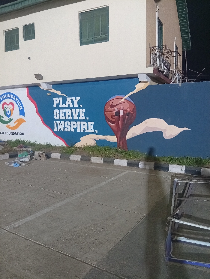 A large mural adorns a wall. On the left, a colorful foundation logo is visible. The words "PLAY. SERVE. INSPIRE." are prominently displayed next to an image of a hand holding a basketball. The wall is painted in shades of blue and tan. A building sits behind the mural, featuring windows and a small balcony. The foreground includes a paved area with parking lines, a curb with black and white markings, and some metal construction equipment.