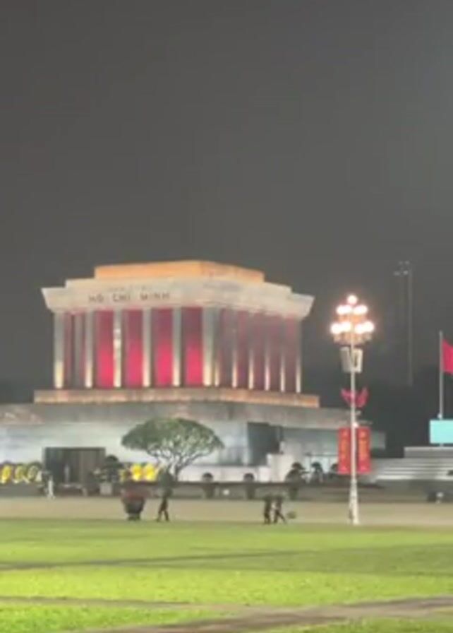 Ho Chi Minh Mausoleum at night. It is illuminated with red and white lights. A grassy field stretches out in front of the mausoleum. There are several people walking around the field, and some are carrying objects. A lamppost stands to the right of the mausoleum, and a Vietnamese flag is visible in the background.