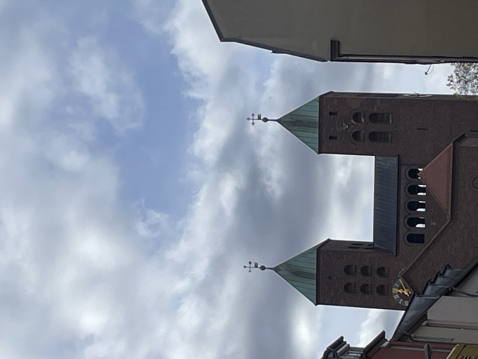 The image displays the St. Kunigund Church in Nuremberg, Germany, located at Sperberstraße 82, 90461 Nürnberg. The church consists of two prominent square towers constructed from red-brown brick. Each tower is capped with a steep, conical roof of patinated copper, exhibiting a greenish-blue hue, and topped with a finial featuring a cross and a small weather vane. The left tower has multiple recessed arched openings and a partially visible circular clock face with gold Roman numerals and hands on its lower section. The right tower also features multiple arched openings and decorative elements. Between the towers, a lower church section is visible, with a dark roof and a series of arched windows. The church structure is partially framed by adjacent buildings. On the left, a multi-story building with a red upper facade and a lighter lower section, topped by an angled dark roof, extends into the frame. On the right, the plain, light-colored wall of another building with a dark roofline partially obscures the right church tower. The sky above is partly cloudy, with a mix of grey and white clouds interspersed with patches of clear blue sky. No individuals or specific actions are discernible in the scene.