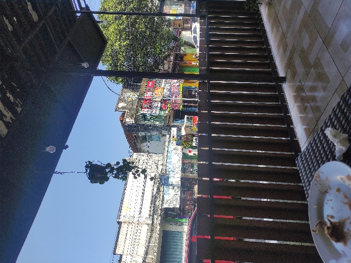 view from a cafe or restaurant patio in Jember, Indonesia (latitude: -8.172, longitude: 113.698). The patio is enclosed by a wooden fence. A partly eaten dessert sits on a dirty plate on a table. The table is on the right side of the frame, with the fence on the left. In the background, a busy street scene unfolds, featuring a row of shops with brightly colored signs. There are numerous hanging plants and a single light fixture. The sky is clear and blue. The scene is in a densely populated area with buildings close together.
